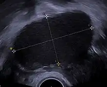 | Transvaginal ultrasonography showing a 67 x 40 mm endometrioma as distinguished from other types of ovarian cysts by a somewhat grainy and not completely anechoic content. | |