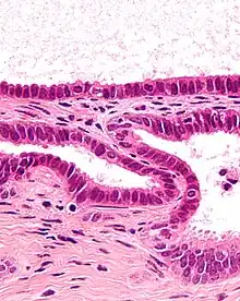 | High magnification micrograph of endosalpingiosis, showing the characteristic cystic spaces lined by a simple epithelium with cilia. H&E stain. | |