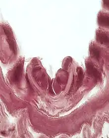 Since the endostyle is found in all three chordate lineages, it is presumed to have arisen in the common ancestor of these taxa, along with a shift to internal feeding for extracting suspended food particles from the water.[2] When feeding, food particles suspended in the water adhere to the mucus the endostyle produces.[3] The filtered water is then expelled through the gill slits, while the food and mucus are swept into the esophagus by movements of the cilia that coat the endostyle.[3][4]