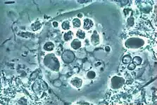 It is found in the mouth[5] inside the gingival pocket biofilm near the base of the teeth, and in periodontal pockets.[1] Entamoeba gingivalis is found in 95% of people with gum disease and rarely in people with healthy gums.[6][7] Cyst formation is not present; therefore transmission is direct from one person to another by kissing, or by sharing eating utensils. Only the trophozoites are formed and the size is usually 20 micrometers to 150 micrometers in diameter. Entamoeba gingivalis have pseudopodia that allow them to move quickly and phagocytise the nucleus of polynuclear neutrophils by exonucleophagy in periodontal disease.[8] Their spheroid nucleus is 2 micrometers to 4 micrometers in diameter and contains a small central endosome. There are numerous food vacuoles, which consists mostly of phagocitised PMN nucleus, blood cells, and bacteria. It also causes pyorrhoea.