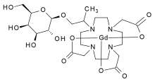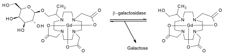 Two distinct β-galactosidase-activated contrast agents have been reported. Both consist of a Gd(III) ion complexed with a tetraazamacrocycle. At the N-10 position, a two-carbon chain links the gadolinium-tertaazamacrocycle complex to a molecule of galactose. The galactose is linked to the complex by a β-glycosidic bond at its C-1 position.[4]