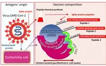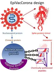 EpiVacCorona (Russian: ЭпиВакКорона, romanized: EpiVacCorona) is a peptide-based vaccine against COVID-19 developed by the Russian VECTOR Center of Virology.[2][3] The lack of protective effectiveness of EpiVacCorona, which is still in use in Russia, has been reported in scientific literature[4] and in the media.[5][6] The vaccine consists of three chemically synthesized peptides (short fragments of a viral spike protein) that are conjugated to a large carrier protein. This protein is a fusion product of a viral nucleocapsid protein and a bacterial MBP protein. A phase III clinical trial to show whether or not the vaccine can protect people against COVID-19 was launched in November 2020 with more than three thousand participants. The conclusions and results of the trial have not been made public.[7][8]