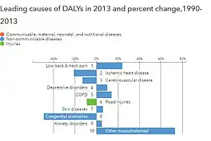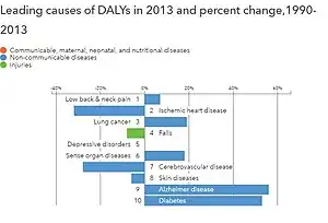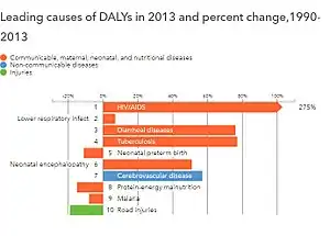 - ↑ Murray, CJL (2015). "Global, regional, and national disability-adjusted life years (DALYs) for 306 diseases and injuries and healthy life expectancy (HALE) for 188 countries, 1990–2013: quantifying the epidemiological transition". The Lancet. 286 (10009): 2145–2191. doi:10.1016/S0140-6736(15)61340-X. PMC 4673910. PMID 26321261.