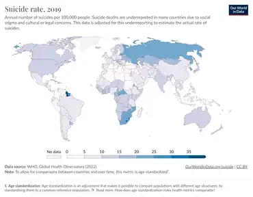 About 21.6 suicide deaths per 100,000 people occur in Russia every year;[9] in southern Africa, the average is about 21 deaths per 100,000 people.[9] The United States reports about 14.5 deaths annually per 100,000 people, however, this rate is steadily increasing. In the 2000s, that rate was 10 people per 100,000 people per year.[9] Within countries there is variety as well. As of 2021, Wyoming is the leading state in annual suicide with 32.3 deaths per 100,000 people. On the other hand, New Jersey, has the lowest suicide rate with 7.1 deaths per 100,000 people.[11]