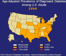 - ↑ Mokdad A, Ford E, Bowman B, Nelson D, Engelgau M, Vinicor F, Marks J (2000). "Diabetes trends in the U.S.: 1990-1998". Diabetes Care. 23 (9): 1278–1283. doi:10.2337/diacare.23.9.1278. PMID 10977060.