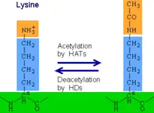 Histone acetylation and deacetylation is a type of epigenetic modification in which acetyl groups are added to lysine on histone tails. Histone acetylation, performed by enzymes known as histone acetyltransferases (HATs), removes the positive charge from lysine and results in gene activation by weakening the histone's interaction with negatively-charged DNA. In contrast, histone deacetylation performed by histone deacetylases (HDACs) results in gene deactivation.