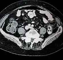 Ultrasound and CT scans are the normal means of positive diagnosis of epiploic appendagitis. Ultrasound scans show "an oval, non-compressible hyperechoic mass with a subtle hypoechoic rim directly under the site of maximum tenderness".[4] Normally, epiploic appendages cannot be seen on CT scan.[4] After cross-sectional imaging and the increased use of abdominal CT for evaluating lower abdominal pain, EA is increasingly diagnosed. Pathognomonic CT scan data represent EA as 2–4 cm, oval shaped, fat density lesions, surrounded by inflammation. Contrasting with diverticulitis findings, the colonic wall is mostly unchanged.