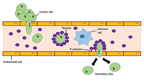 To improve the chances for the development of a cancer metastasis, a cancer cell must avoid detection and targeting by the immune system once it enters the bloodstream. Activated platelets have the ability to bind glycoproteins and glycolipids (P-selectin ligands such as PSGL-1) on the surface of cancer cells to form a physical barrier that protects the cancer cell from natural killer cell-mediated lysis in the bloodstream.[65] Furthermore, activated platelets promote the adhesion of cancer cells to activated endothelial cells lining blood vessels using adhesion molecules present on platelets.[66][64] P-selectin ligands on the surface of cancer cells remain to be elucidated and may serve as potential biomarkers for disease progression in cancer.[64]