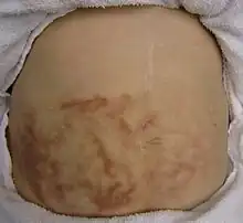 | Erythema ab igne in a person with chronic abdominal pain who found some relief from the application of heat. | |