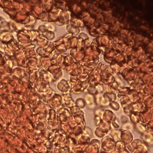 Erythrocytes aggregate in a special way, forming rouleaux. Rouleaux are stacks of erythrocytes which form because of the unique discoid shape of the cells in vertebrate body. The flat surface of the discoid RBCs give them a large surface area to make contact and stick to each other; thus, forming a rouleau. Rouleaux formation takes place only in suspensions of RBC containing high-molecular, fibrilar proteins or polymers in the suspending medium (often Dextran-2000 in-vitro). The most important protein causing rouleaux formation in plasma is fibrinogen. RBC suspended in simple salt solutions do not form rouleaux.[1][2][3]