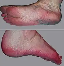 The most prominent symptoms of erythromelalgia are episodes of erythema, swelling, a painful deep-aching of the soft tissue (usually either radiating or shooting) and tenderness, along with a painful burning sensation primarily in the extremities. These symptoms are often symmetric and affect the lower extremities more frequently than the upper extremities. Symptoms may also affect the ears and face. For secondary erythromelalgia, attacks typically precede and are precipitated by the underlying primary condition. For primary erythromelalgia, attacks can last from an hour to months at a time and occur infrequently to frequently with multiple times daily. Attacks most frequently occur at night, thus having the potential to greatly interfere with sleep. Common triggers for daytime episodes are exertion, heating of the affected extremities, and alcohol or caffeine consumption, and any pressure applied to the limbs. In some patients sugar and even melon consumption have also been known to provoke attacks. Many of those with primary erythromelalgia avoid wearing shoes or socks as the heat this generates is known to produce erythromelalgia attacks.[9] The coexistence of erythromelalgia and Raynaud's phenomenon is rare, but case studies of patients with both diagnoses have been reported in medical journals.[17] Symptoms may present gradually and incrementally, sometimes taking years to become intense enough for patients to seek medical care. In other cases symptoms emerge full blown with onset.