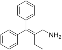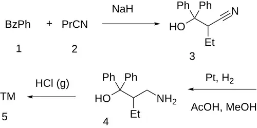 The base-catalyzed reaction between benzophenone (1) and butyronitrile (2) gives 2-[hydroxy(diphenyl)methyl]butanenitrile (3).[2][3] Catalytic hydrogenation reduces the nitrile group to a primary amine giving 1,1-diphenyl-2-ethyl-3-aminopropanol (4). The tertiary hydroxyl group is dehydrated by treatment with anhydrous hydrogen chloride gas, completing the synthesis of etifelmine (5).