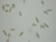 Euglena gracilis is a freshwater species of single-celled alga in the genus Euglena. It has secondary chloroplasts, and is a mixotroph able to feed by photosynthesis or phagocytosis. It has a highly flexible cell surface, allowing it to change shape from a thin cell up to 100 μm long to a sphere of approximately 20 μm. Each cell has two flagella, only one of which emerges from the flagellar pocket (reservoir) in the anterior of the cell, and can move by swimming, or by so-called "euglenoid" movement across surfaces. E. gracilis has been used extensively in the laboratory as a model organism, particularly for studying cell biology and biochemistry.[1]