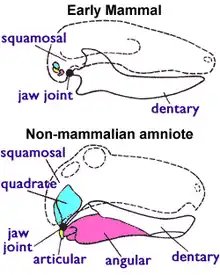 Early amniotes had a jaw joint composed of the articular (a small bone at the back of the lower jaw) and the quadrate (a small bone at the back of the upper jaw). All non-mammalian amniotes use this system including lizards, crocodilians, dinosaurs (and their descendants the birds) and therapsids; so the only ossicle in their middle ears is the stapes. The mammalian jaw joint is composed of different skull bones, including the dentary (the lower jaw bone which carries the teeth) and the squamosal (another small skull bone). In mammals, the quadrate and articular bones have evolved into the incus and malleus bones in the middle ear.[20][21]