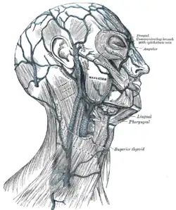 ![]() Veins of the head and neck. (External jugular visible at center.) | |