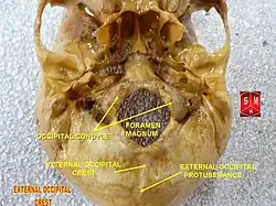 The external occipital crest is part of the external surface of the squamous part of the occipital bone. It is a ridge along the midline, beginning at the external occipital protuberance and descending to the foramen magnum, that gives attachment to the nuchal ligament.[1] It is also called the median nuchal line.[2]