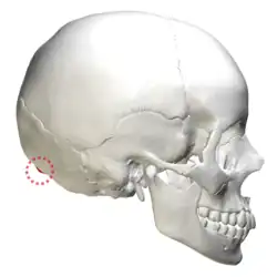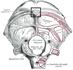 ![]() Human skull lateral view. External occipital protuberance shown in red. | |