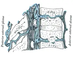 The external vertebral venous plexuses (extraspinal veins) consist of anterior and posterior plexuses which anastomose freely with each other. They are most prominent in the cervical region[1] where they form anastomoses with the vertebral, occipital, and deep cervical veins.[2]