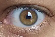 In humans, the pigmentation of the iris varies from light brown to black, depending on the concentration of melanin in the iris pigment epithelium (located on the back of the iris), the melanin content within the iris stroma (located at the front of the iris), and the cellular density of the stroma.[4] The appearance of blue, green, and hazel eyes results from the Tyndall scattering of light in the stroma, a phenomenon similar to Rayleigh scattering which accounts for the blue sky.[5] Neither blue nor green pigments are present in the human iris or vitreous humour.[3][6] This is an example of structural color, which depends on the lighting conditions, especially for lighter-colored eyes.