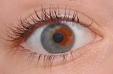 Heterochromia (heterochromia iridum or heterochromia iridis) is an eye condition in which one iris is a different color from the other (complete heterochromia), or where a part of one iris is a different color from the remainder (partial heterochromia or sectoral heterochromia). It is a result of the relative excess or lack of pigment within an iris or part of an iris, which may be inherited or acquired by disease or injury.[86] This uncommon condition usually results due to uneven melanin content. A number of causes are responsible, including genetic, such as chimerism, Horner's syndrome and Waardenburg syndrome.