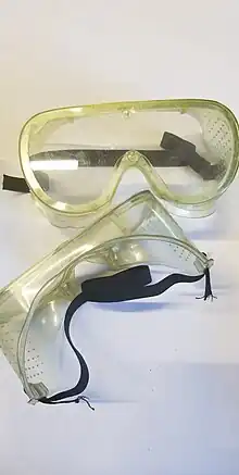 Goggles are forms of protective eyewear that enclose the eye area in order to prevent particulates, infectious fluids, or chemicals from striking the eyes. Goggles come in two styles, eyecup goggles, and cover goggles. Eyecup goggles completely cover the eye socket to give all-round protection. They have adjustable or elasticized headbands and often are equipped with ventilation ports to allow air in and prevent fogging. For example, swimming goggles to protect the eyes from salt or chlorine. Cover goggles are designed to be worn over eye wear.[1] Like eyecup goggles, they have adjustable or elasticized headbands and are equipped with direct or indirect ventilation ports to allow air in and prevent fogging. While both models keep out large particles, indirect-vented goggles are better at keeping out liquids and dusts.