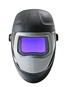 A welding helmet is a type of headgear used when performing certain types of welding to protect the eyes, face and neck from flash burn, ultraviolet light, sparks, infrared light, and heat. A welding hand shield is a metal plate containing the same protective lens as a welding helmet with a handle on the bottom, intended to be held up in front of the face while working.
