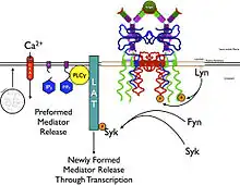 - ↑ Siraganian RP (December 2003). "Mast cell signal transduction from the high-affinity IgE receptor". Current Opinion in Immunology. 15 (6): 639–646. doi:10.1016/j.coi.2003.09.010. PMID 14630197. S2CID 39294873.
