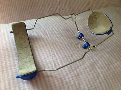 A facemask (also referred to as a protraction facemask, orthopedic facemask, or reverse-pull headgear) is a type of an orthodontic headgear used to treat underbite and other malocclusions where the upper jaw is too far backwards.[1] A metal bar sits in front of the patients face with support from the forehead and chin. Elastics are connected to the metal bar and the teeth - directly through the lips / mouth of the patient. The elastics apply forward and downward pressure on the upper jaw. Thus the force direction is the opposite from a standard headgear which is why this appliance is also known as a reverse-pull-headgear. [1]