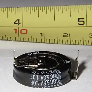 ![]() A 1-farad supercapacitor. The scale behind is in inches (top) and centimetres (bottom). | |