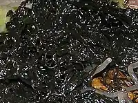 Fat choy (traditional Chinese: 髮菜; simplified Chinese: 发菜; pinyin: fàcài; Jyutping: faat³ coi³; Nostoc flagelliforme) is a terrestrial cyanobacterium (a type of photosynthetic bacteria) that is used as a vegetable in Chinese cuisine. When dried, the product has the appearance of black hair. For that reason, its name in Chinese means "hair vegetable". When soaked, fat choy has a soft texture which is like very fine vermicelli.