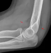 The fat pad sign, also known as the sail sign, is a potential finding on elbow radiography which suggests a fracture of one or more bones at the elbow. It may indicate an occult fracture that is not directly visible. Its name derives from the fact that it has the shape of a spinnaker (sail).[1] It is caused by displacement of the fat pad around the elbow joint. Both anterior and posterior fat pad signs exist, and both can be found on the same X-ray.