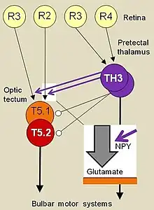 As explained above, the optic tectum is responsible for the orienting and snapping responses in prey-catching behavior; however, Ewert's research also revealed that focal electrical stimulation of the thalamic and pretectal brain regions evoked different kinds of avoidance behaviors in the toad.[16] Feature detectors were also observed in these brain regions. Neurons were observed to be either directionally-sensitive to looming large objects, size-selective or perceptive to stationary obstacles. Certain pretectal thalamic neurons, type TH3, showed a preference for big moving objects and the anti-worm configuration of moving bar stimuli.[17] It is suggested that the selectivity of tectal prey feature detectors, type T5.2, is determined by inhibitory influences of pretectal anti-worm detectors of the type TH3. Pretectal lesions impaired the prey-selectivity.[15]