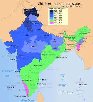 The child sex ratio is within the normal range in all eastern and southern states of India,[4] but significantly higher in certain western and particularly northwestern states such as Maharashtra, Haryana, Jammu and Kashmir (118, 120 and 116, as of 2011, respectively).[5] The western states of Maharashtra and Rajasthan 2011 census found a child sex ratio of 113, Gujarat at 112 and Uttar Pradesh at 111.[6] The higher ratios in Maharashtra and Gujrat can also be attributed to an influx of male migration into the region.