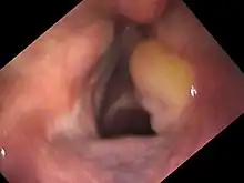 Granuloma in the vocal cords is also a possible complication, which may cause a soft and whispery voice. The granuloma should eventually be coughed out, or in some case be removed manually.[18] Dysphonia is another common symptom in the first two months of recovery, but the issue gradually resolves in most patients. Further treatment or revision surgery might be needed for some patients with serious unresolved sound hoarseness after extended periods of recovery.[16] If the vocal cords heal with asymmetrical tension, laser treatment is generally required to correct the defect.
