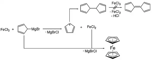 The first reported syntheses of ferrocene were nearly simultaneous. Pauson and Kealy synthesised ferrocene using iron(III) chloride and cyclopentadienyl magnesium bromide.[11] A redox reaction produces iron(II) chloride. The formation of fulvalene (the intended outcome), does not occur.[8]