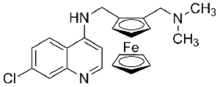 Ferroquine is a synthetic compound related to chloroquine which acts as an antimalarial, and shows good activity against chloroquine-resistant strains.[1] It contains an organometallic ferrocene ring which is unusual in pharmaceuticals,[2][3][4] and while it was first reported in 1997,[5] it has progressed slowly through clinical trials, with results from Phase II trials showing reasonable safety and efficacy, and further trials ongoing.[6][7]