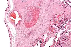 | Intermediate magnification micrograph of the placental disc showing a thrombosed fetal vein, as may be seen in fetal thrombotic vasculopathy. H&E stain. | |