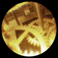 A low quality fiberscope observing the inside of an antique clock mechanism. Note how individual fibers are discernable, as each fiber only relays one part of the image.