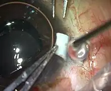 ![]() Fibrin glue applied after drying the scleral bed in an intraocular lens operation | |
