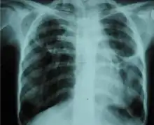 Fibrothorax is a medical condition characterised by severe scarring (fibrosis) and fusion of the layers of the pleural space surrounding the lungs resulting in decreased movement of the lung and ribcage.[1] The main symptom of fibrothorax is shortness of breath. There also may be recurrent fluid collections surrounding the lungs. Fibrothorax may occur as a complication of many diseases, including infection of the pleural space known as an empyema or bleeding into the pleural space known as a haemothorax.[2]