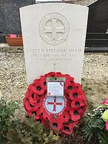 By the Armistice, the Corps had been awarded many decorations for bravery, including 17 Military Medals, 1 Legion d'Honneur and 27 Croix de Guerre.[12] Although a number of FANYs were injured while serving in France, there was only one death; Evelyn Fidgeon Shaw CdeG died while serving with the French and was buried by them with full military honours in Sézanne.[13]
