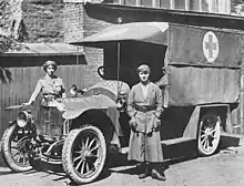 It was formed as the First Aid Nursing Yeomanry in 1907 as a first aid link between the field hospitals and the front lines, and was given the 'yeomanry' name as its members were originally mounted on horseback. Unlike nursing organisations, the FANY saw themselves rescuing the wounded and giving first aid, similar to a modern combat medic.[3][4] Their founder, Sergeant Major, later Captain, Edward Baker, a veteran of the Sudan Campaign and the Second Boer War, felt that a single rider could get to a wounded soldier faster than a horse-drawn ambulance.[5][6] Each woman was trained not only in first aid but signalling and drilling in cavalry movements.[7] The original uniform was a scarlet tunic with white facings, a navy-blue riding skirt with three rows of white braid at the bottom and a hard-topped scarlet hat with black-leather peak. The uniform gradually became more practical and less flamboyant, including importantly, a divided skirt to allow public riding astride. By 1914 it consisted of a khaki tunic, khaki skirt and a khaki solar topee. Shortly after their arrival in France, at the beginning of the First World War, the topee was discarded in favour of a soft bonnet, the hard topee proving impractical for driving an ambulance with a low canvas roof.