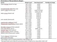 Bony fishes have, depending on the species, combined for all three parvalbumin lineages (alpha, oncomodulin [sometimes called beta-1], and beta-2) between 7 and 22 genes.[41][42] Although in most bony fishes the β-2 parvalbumins are the major allergens, in some bony fishes the α-parvalbumins are the highest expressed in muscle and were identified as the allergens.[42] The allergen nomenclature is partly based on the order of allergen detection per species, and therefore identical allergen numbers in different fish species do not always refer to the same gene (see the table).[43]