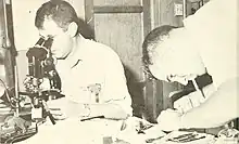 Department disease laboratory researchers (Harold Wolf and Bill Schafer) investigate a trout disease threat in a commercial hatchery.