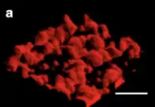 Flavobacteriia forming mudflat biofilms, as shown through confocal laser scanning microscopy in a 3D view. Growth took place over 24 hours on glass surfaces under dynamic conditions and stained with Syto 61 red. Scale bar: 67.3μm.[19]