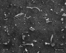 Flock worker's lung is caused by exposure to small pieces of flock, usually nylon, created during the flocking process and inhaled.[1][3] Exposure to rotary-cut flock particulates is the main risk factor; whether or not other types of flock cause this pulmonary fibrosis is not yet determined.[5] Other types of flock include rayon, polypropylene, and polyethylene.[1] Workers exposed to nylon, polypropylene, polyethylene, and rayon flocking debris have developed flock worker's lung.[4][7] Exposure to higher concentrations of respirable flock particles is associated with more severe disease.[8]