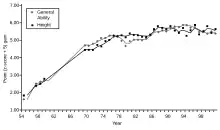 Teasdale and Owen (2005) examined the results of IQ tests given to Danish male conscripts. Between 1959 and 1979 the gains were 3 points per decade. Between 1979 and 1989 the increase approached 2 IQ points. Between 1989 and 1998 the gain was about 1.3 points. Between 1998 and 2004 IQ declined by about the same amount as it gained between 1989 and 1998. They speculate that "a contributing factor in this recent fall could be a simultaneous decline in proportions of students entering 3-year advanced-level school programs for 16–18-year-olds."[60] The same authors in a more comprehensive 2008 study, again on Danish male conscripts, found that there was a 1.5-point increase between 1988 and 1998, but a 1.5-point decrease between 1998 and 2003/2004.[61]