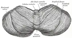 Laterally, it expands in either hemisphere into a considerable lobule, the superior semilunar lobule (lobulus semilunaris superior; postero-superior lobules), which occupies the posterior third of the upper surface of the hemisphere, and is bounded below by the horizontal sulcus.