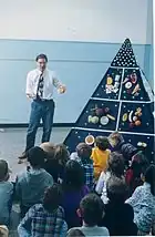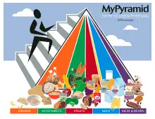 A food pyramid is a representation of the optimal number of servings to be eaten each day from each of the basic food groups.[2] The first pyramid was published in Sweden in 1974.[3][4][5] The 1992 pyramid introduced by the United States Department of Agriculture (USDA) was called the "Food Guide Pyramid" or "Eating Right Pyramid". It was updated in 2005 to "MyPyramid", and then it was replaced by "MyPlate" in 2011.[6][7]