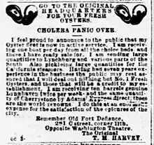 ![]() Oyster seller in Washington D.C. claims "CHOLERA PANIC OVER" in October 1866 | |